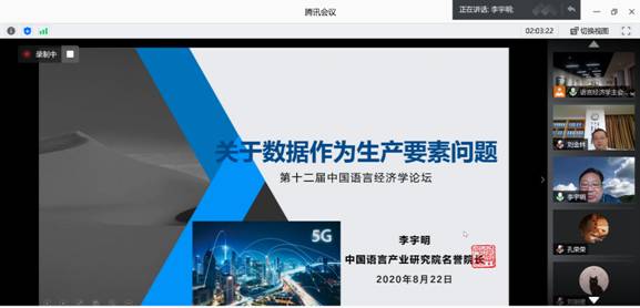 中国语言产业研究院名誉院长、北京语言大学原党委书记李宇明教授作了题为《关于数据作为生产要素的问题》的报告,强调了语言数据在语言保护、语言教育和语言信息化领域的关键性作用以及语言数据与新基建、数字经济的紧密联系。教育部语言研究所所长、《语言文字应用》主编刘朋建研究员从多角度深刻分析了新时代语言文字事业发展的形势,深刻分析了新时代语言文字事业发展的核心任务、战略任务、时代课题与重要保障。球探网篮球比分 语言经济研究中心主任张卫国教授聚焦语言与健康治理这一语言生活研究的新议题,认为在此议题下个体层面的语言能力与健康的关系、国家层面的语言规划与健康治理互动的问题值得下一步深度挖掘。首都师范大学语言产业研究院院长、《语言产业研究》主编李艳教授着重对新一轮经济变革中中国语言产业连接传统与现代的重要历史功能与使命、语言技术赋能新经济与新业态的表现形式以及协同共建语言产业交叉学科具体方向的未来展望做了系统分享。广西民族大学社科处处长刘金林教授从人力资本视角探究了少数民族地区推普助力脱贫攻坚问题,认为语言具备作为人力资本的四大特征,提出最大普通话效应机能理论并实证研究了中国边境地区普通话的异质性劳动收入效应。球探网篮球比分 苏剑副教授进行了题目为《国家发展战略中的语言占位与语言经济》的报告,从一带一路与语言红利等七个维度对语言占位和语言经济发展新动向、新需求、新热点进行了详细剖析和解读。