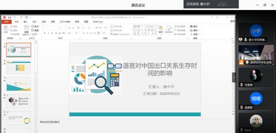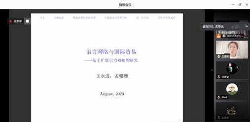 第一阶段论文代表大会发言由球探网篮球比分 副院长韦倩教授主持。哈尔滨工业大学经济与管理球探比分网 洪涛,球探网篮球比分 厚鑫,中央财经大学经济球探比分网 王麓淙,北京师范大学汉语文化球探比分网 李承妍,德州球探比分网 外国语球探比分网 李龙,山东大学国际教育球探比分网 连佳等分别就方言相关多样性与经济增长,方言的经济学分析综述,民族地区语言扶贫成效,新冠疫情中汉英新闻标题中的合法化话语策略,英语测试的信号传递效应,国际本科预科生语言服务等议题汇报了各自的最新研究进展。