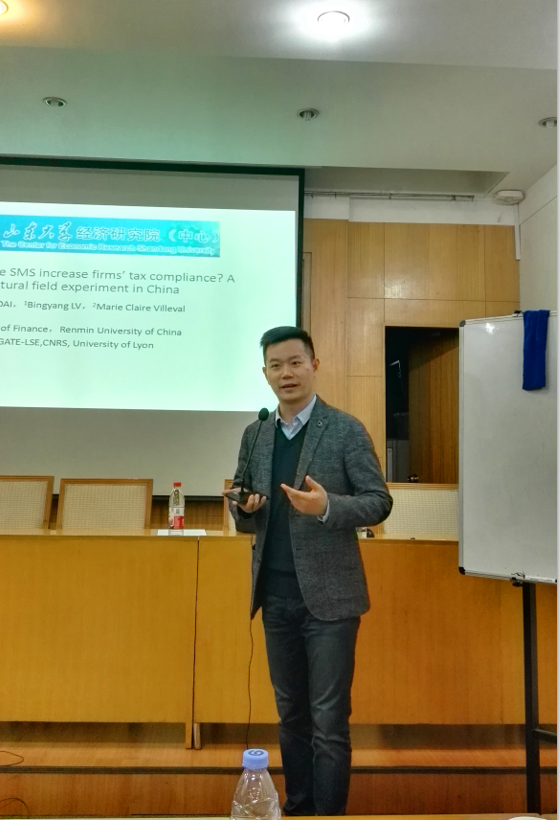 十分钟休息后,代志新老师为大家带来他的报告:Can A Simple SMS Increase Firms’ Tax Compliance? A Natural Field Experiment in China。代老师首先向大家介绍了他的学习及工作背景,进而由他目前的工作引出他此次报告的研究背景和研究思路。逃税现象的存在是他的研究动机之一。与国外相比,国内对此问题的自然实地实验(natural field experiment)研究可能尚为空白。从研究动机、现实情况、研究目标、实验设计到实验结果和关于结果的思考,代老师为大家做出了富有逻辑的说明。研究结果表明,简单的信息推送即可显著提高纳税人的纳税遵从度。其中,一个具有“中国特色”的结果为:发送信号对提高缴税申报率有显著作用,而信号内容(道德鼓励或威胁)则对申报率提升没有显著影响。该研究的发现对于税收征管政策的设计具有重要的现实意义。