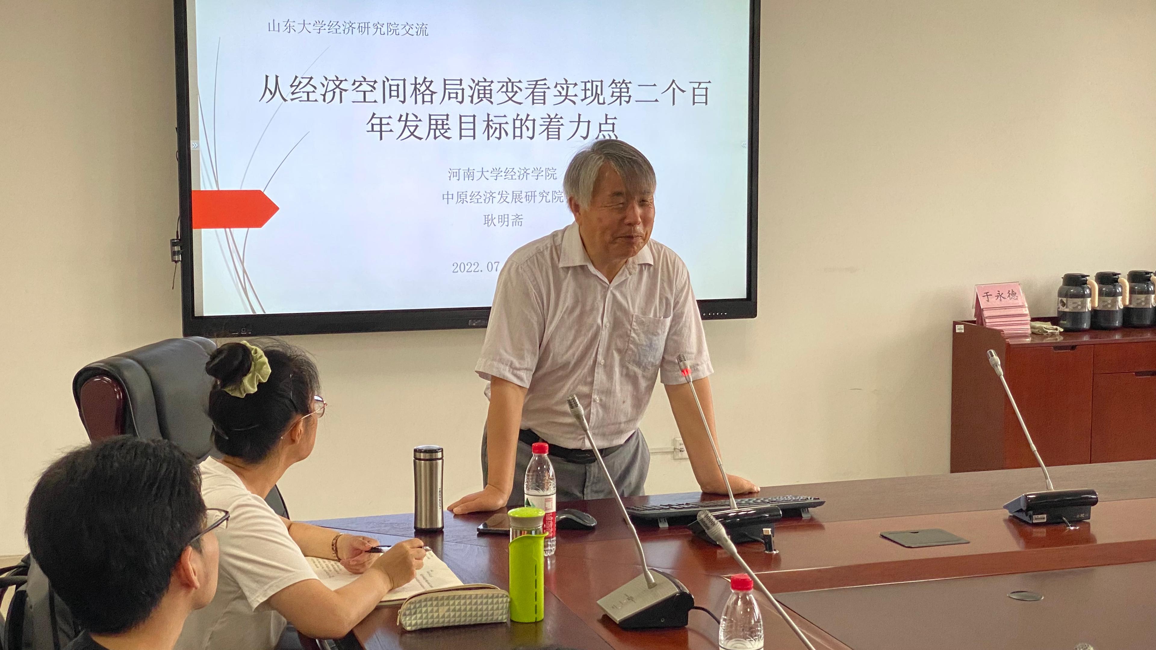 资深教授、原院长耿明斋教授作了题为“从经济空间格局演变看实现第二个百年发展目标的着力点”的主题报告。他强调山东与河南的地理和文化联系非常强,全面系统地介绍河南2008年以来经济发展的情况,并且与山东进行比较,分析各自的优势和劣势以及巨大的互补性,他强调:一是鲁豫两省合作的空间很大,也很有必要,要破除要素流动壁垒,加强基础设施建设,促进人员在区域间的自由流动;二是人的现代化水平是区域现代化水平的决定因素,未来要进一步改造人的价值判断和思维方式;鲁豫两省合作发展有利于遏制南北经济差距扩大和黄河流域平衡。