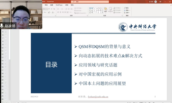 赵扶扬老师首先以新发展格局为起点,从空间格局引出报告主题,并分析了动态量化空间均衡模型相对于传统研究范式的优势:可以同时对多个经济变量的互动关系展开研究,还可以匹配多维度现实数据,实现丰富、可信的量化分析。其次,赵老师讲述了模型应用的技术难点,并提出分离迁移与储蓄决策和调整理性预期行为两种简化方式。接着,赵老师介绍了模型的应用领域与研究话题,他指出,该模型可以在宏观经济和发展经济、劳动力市场、企业动态、房地产市场和金融市场、环境问题及区域贸易等多个领域进行应用。接下来,赵老师指出了该模型在中国宏观经济中的应用实例与应用展望。最后,在互动环节中,赵扶扬老师讲解了动态量化空间均衡模型与DSGE 等模型的区别,并介绍了相关软件和经典文献,老师和同学们表示受益匪浅。