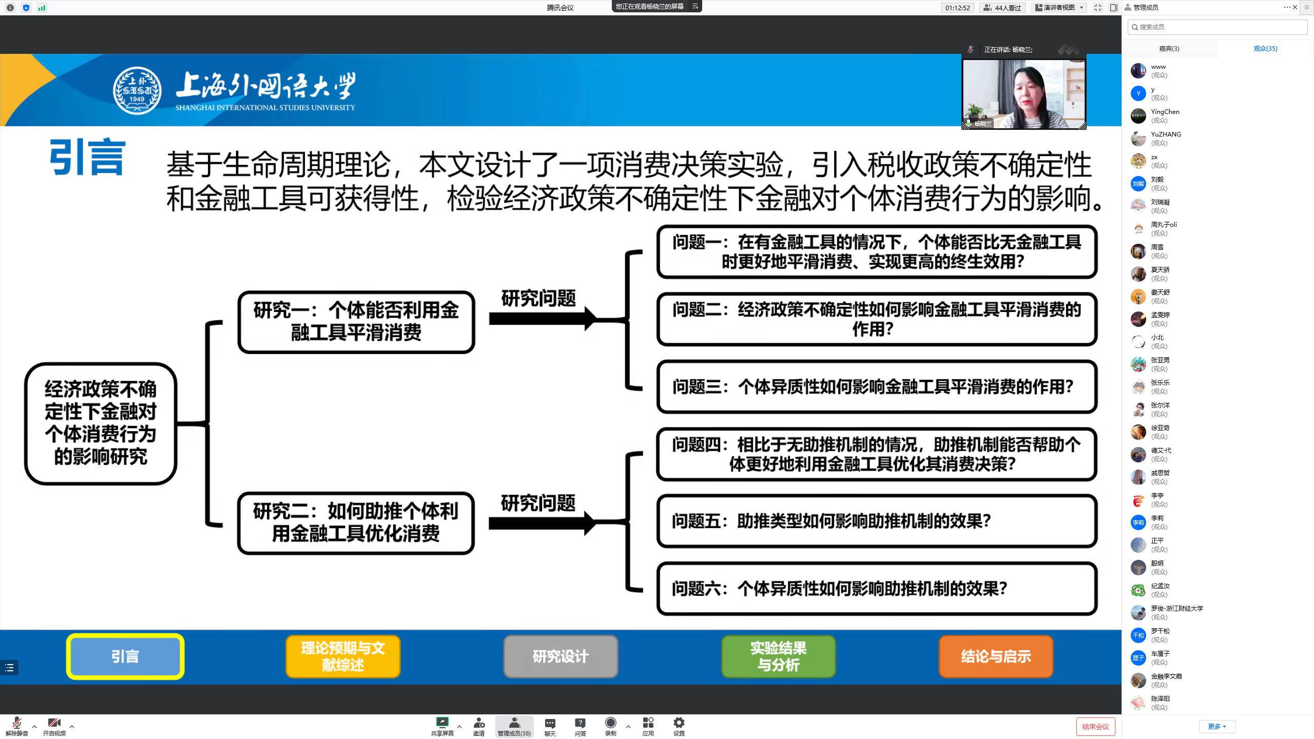 2022年11月9日14:30,山大行为实验经济公开分享荟2022年第9期在腾讯会议线上平台顺利进行,杨晓兰教授做客此次讲坛,讲述的主题为“个体能利用金融工具优化消费吗?——来自生命周期消费实验的证据”。此次讲坛由球探比分网