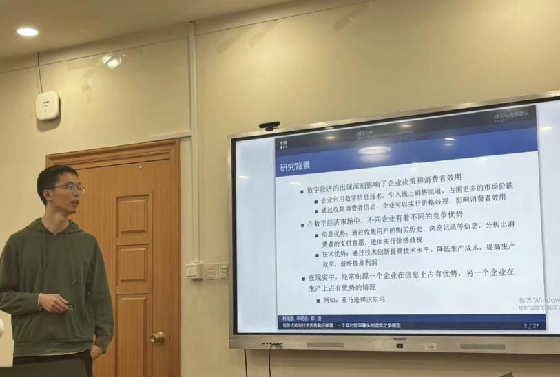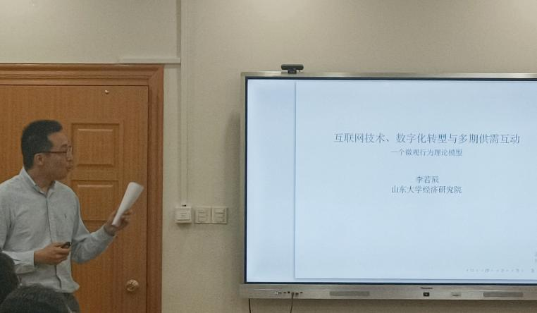 副教授李若辰作了题为“互联网技术、数字化转型与多期供需互动:一个微观行为理论模型”的报告。该研究结合现实市场中广泛存在的价格离散现象,构建了一个双寡头厂商在两期内向消费者出售同质商品的理论模型,以探讨互联网技术的普及与企业数字化转型如何影响社会福利。研究发现,随着互联网技术的广泛应用,厂商利润(消费者剩余)严格下降(上升)。但是当厂商经过数字化转型有能力施行基于行为价格歧视时,厂商所获取的超额利润呈现先增加后减少的“倒U型”趋势。