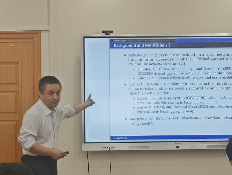 孟大文教授作了题为“Relative and Structural Network Interventions in Local Average Model”的报告。报告分析了局部平均设置下的网络博弈,其中参与者的收益取决于其所面对的社会规范。研究关注最优目标干预问题,其中规划者试图通过改变个体属性并且/或者在某些约束下重组底层网络来最大化其目标。报告首先讨论了相对特征干预问题,接着转向结构干预问题。研究发现,能否取得积极的效果取决于个体的从众心理以及对轻微损失的容忍程度。