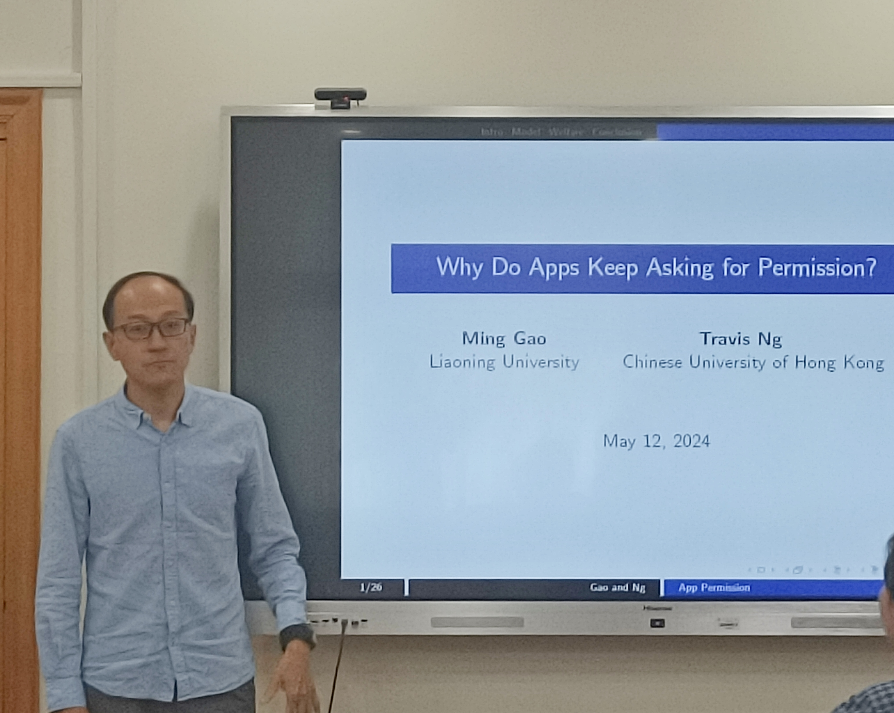 教授高明作了题为“Why Do Apps Keep Asking for Permission?”的报告。报告讨论了一些平台应用程序不断地骚扰用户、要求他们授予不同类型的访问权限的现象。由于应用程序无法采用传统的差别性定价,因此他们会通过这类骚扰策略来实现以不同的方式对待不同类型的用户。有时,这种听起来不讨喜的策略对应用程序是有利可图的,并且不会减少社会剩余。报告讨论了需要强制推行“不再提示”选项的条件。
