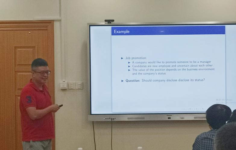 副教授陈博作了题为“All-Pay Auctions with Affiliated Types and Values: Equilibria and Information Disclosure”的报告。报告讨论了具有附属类型和相互依存价值的全支付拍卖中的均衡和信息披露的问题。报告指出,企业的最优策略表现为“几乎完全披露”:它使投标人能够将范围缩小到最多三种状态,而真实状态就是其中之一。关键信息是,当且仅当投标人无法在事先分配下赚取任何租金时,组织者可以通过信息披露充分提取剩余。