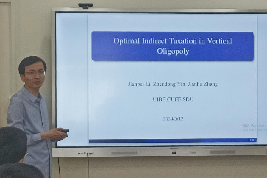 教授尹振东作了题为“Optimal Indirect Taxation in Vertical Oligopoly”的报告。报告提出了一个上下游都有内生进入的垂直寡头垄断模型,讨论间接从价税的最优性。报告指出,当上游企业的进入成本不可忽略时,征收间接税是最优的。这与文献中普遍存在的对上游企业征税不如对下游企业征税的结论形成鲜明对比。其中,驱动力是上下游企业的相对生产效率与税收效率之间的权衡。