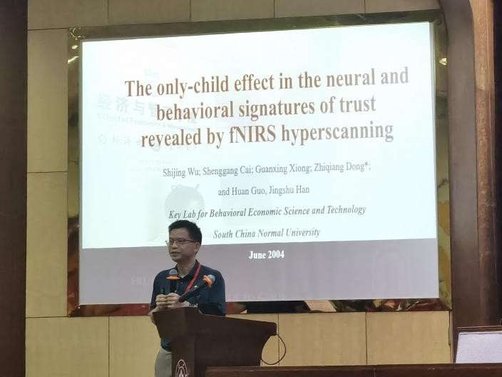 华南师范大学董志强教授进行了题为”The only-child effect in the neural and behavioral signatures of trust revealed by fNIRS hyperscanning”的报告。信任在人际交往中很重要,然而人们对人际大脑在信任方面的同步性知之甚少。董教授开展了将功能性近红外光谱超扫描应用于序列相互信任任务的研究。研究根据参与者(陌生人)是否为独生子女将其分为两组。两个陌生人在一个在线信任游戏中相互交流,他们在内侧前额叶皮层(mPFC)和右侧颞顶叶交界处(rTPJ)的大脑活动被记录。研究结果表明,与非独生子女组相比,独生子女组在这一过程中表现出更低的还款、更少的回报和更少的合作决策。研究结果发现,独生子女表现出的信任比非独生子女少,导致大脑间的连贯性降低,从而提供了独生子女效应的神经行为实验证据。