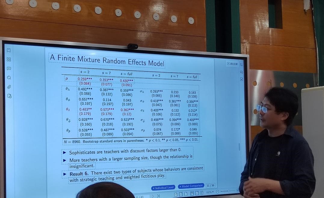 李智老师通过实验探讨了动态抽样中的均衡演化,考察了抽样大小对转换效率的影响。李老师考虑了一个具有三个帕累托排序均衡的协调博弈的均衡转换,从最低效均衡出发,通过改变个体获得的关于对手行为信息的样本数量,对完全信息与不完全信息对转换均衡的影响进行理论预期与实验设计。研究发现,实验结果与理论预期不同。理论预期信息抽样数量越少,越多个体会转向最高效均衡。而实验结果发现抽样数量越大,向更高效均衡的演化越快,累积收益也越高。李老师通过不同实验局的比较、结构估计和模拟,确定了均衡演化的两个渠道,即策略教学和加权虚拟博弈,它们导致个体在抽样数量较大时向更高效均衡的演化速度提升。总体而言,该研究为采样最佳反应动态模型提供了实验证据,强调了抽样数量对均衡转换的影响,并为理解个体在不完全信息和完全信息环境下的行为提供了新的视角。