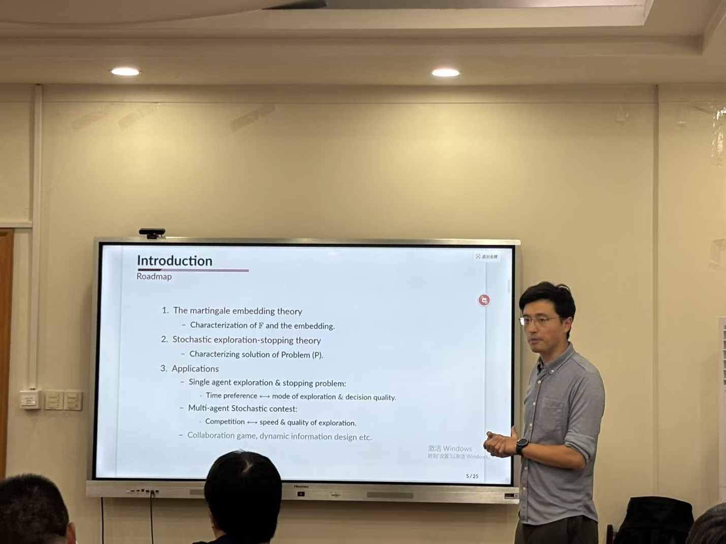 钟伟杰老师在其研究中基于一个有界的鞅(martingale)过程实施停止所能实现的全部状态-时间联合分布,完整刻画了决策者最优停止行为的集合,并进而对最优停止问题中的动态信息设计提供了一种通用的同时考虑时间与状态二维变量的最优信息政策求解方法。钟老师在研究中进一步考虑了一个博弈情境下的“委托-代理”问题,并证明即便代理人具有任意复杂甚至非标准的偏好结构,委托人仍然可以在不依赖跨期承诺(intertemporal commitment)的情况下,设计出具备“反显示原理”的最优动态信息机制。报告结束后,钟伟杰老师与现场的师生进行了互动,讨论并详细解答了师生的提问。