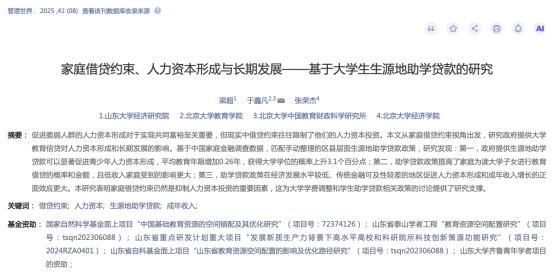 博士毕业生,现在北大从事博士后研究工作)合作的研究“家庭借贷约束、人力资本形成与长期发展——基于大学生生源地助学贷款的研究”发表在顶级期刊《管理世界》,代表着球探比分网