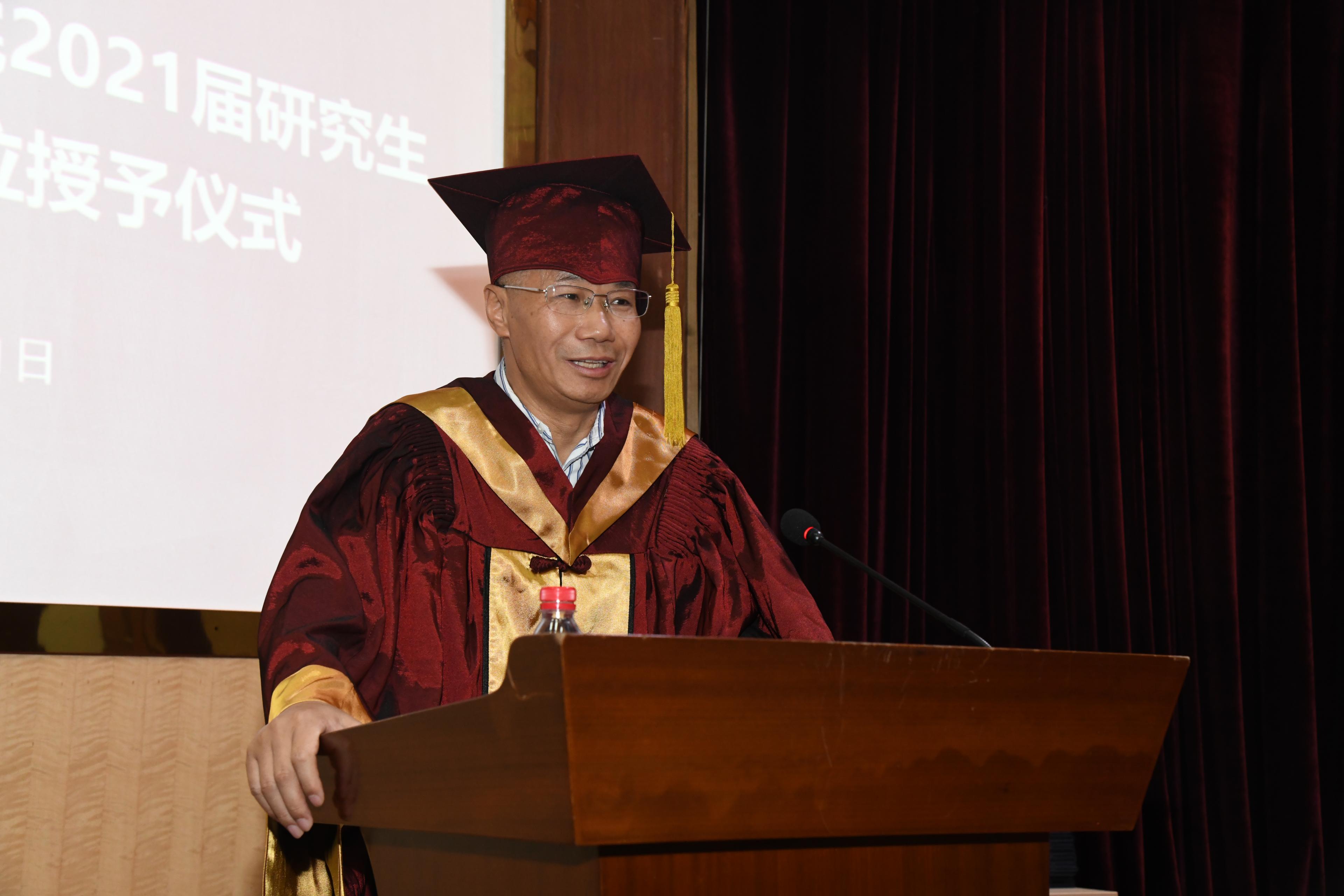 副院长杨宏力致辞,对圆满完成学业的博士、硕士毕业生表示热烈祝贺,他结合自己毕业后的学习和工作经验从规划和路径关系、能力和态度关系、做人和做事的关系、改造环境和适应环境的关系、辩证看待公私关系以及可有可无和不可或缺的关系六个方面分享了自己的感悟。他勉励大家不管是继续学习还是走上工作岗位,都需要且思且行、善于规划、端正态度,辩证看待遇到的问题并把握这几种关系。