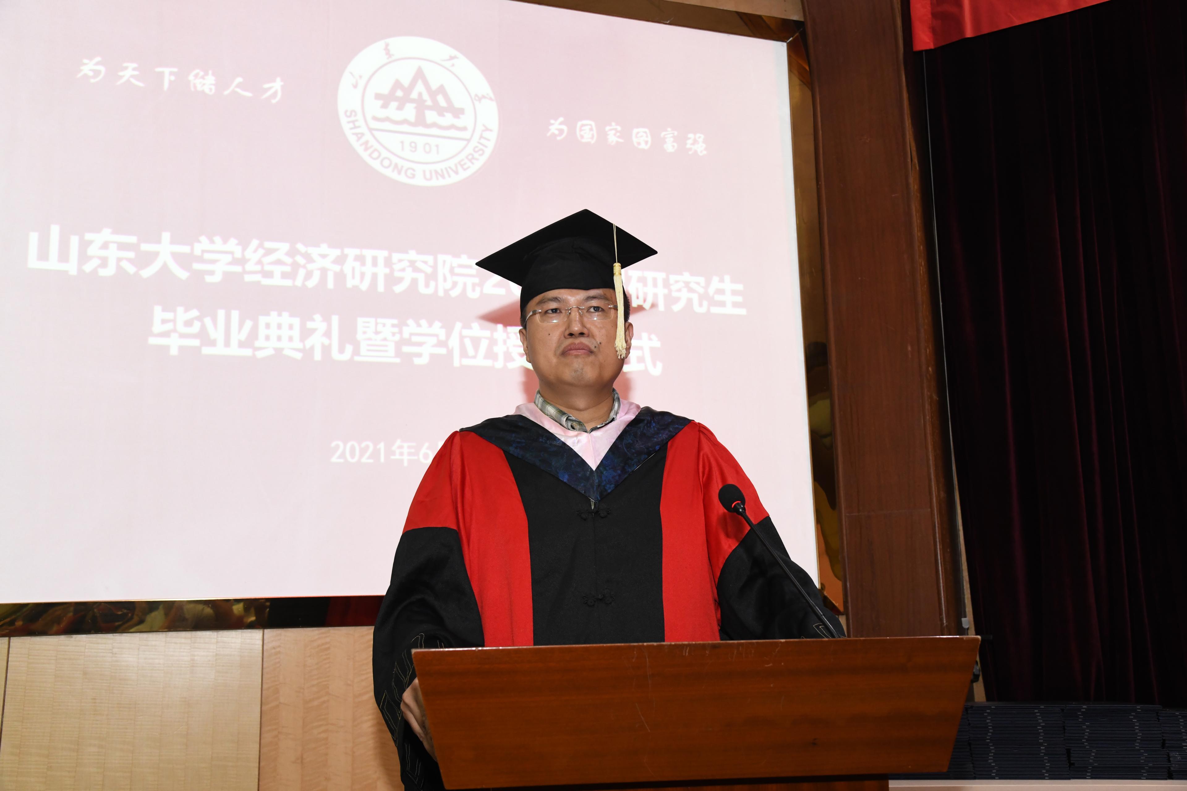 院长黄少安教授致辞。黄少安院长回顾了自己学习和工作历程中的点点滴滴,通过自己成长的故事,勉励大家不负韶华、虚心学习、开阔视野、心系家国,寄语毕业生同学:“人各有志,人贵有志,做好人生规划”,在不同的岗位上都要保持志向,发扬经研人的风骨,在建党一百周年之际,继续砥砺前行,为国家和社会做出贡献;“守住底线,放飞上线”,保持底线思维,不断取得新的上线突破,开创新的辉煌;“少一点功利主义,多一点家国情怀”,将个人命运熔铸到国家和时代发展历程中去。
