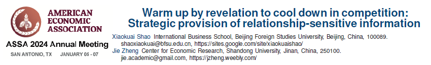 特聘教授郑捷和连暐虹(Jaimie W. Lien)赴美国圣安东尼奥参加2024年ASSA年会,共计报告6份合作研究成果,创国内学者入选研究数量之最。其中,一份为实证方法为主的研究,两份为实验方法为主的研究,三份为理论方法为主的研究。合作者分别为暨南大学经济球探比分网