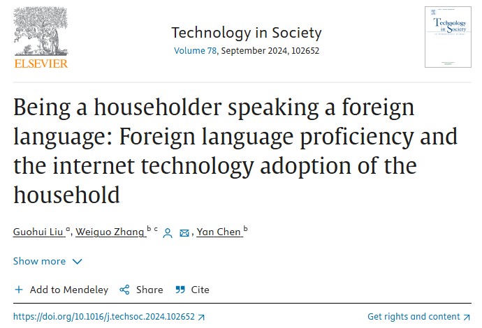 发表在《Technology in Society》(2024,Vol. 78;SSCI收录, JIF 10.1,JCR Q1区,中科院一区Top期刊)的论文——《Being a Householder Speaking a Foreign Language: Foreign Language Proficiency and the Internet Technology Adoption of the Household》,基于语言与技术的跨学科理论视角,系统探讨了外语能力对中国家庭互联网技术利用的影响及其内在机制。研究发现,和户主不懂外语的家庭相比,户主懂外语的家庭采用互联网技术的可能性明显增加。外语能力对中国家庭互联网技术利用的积极影响在男性户主家庭、城市地区和东中部地区更为显著。信息效应、信任效应和收入效应是外语能力影响家庭互联网技术利用的三种潜在机制。上述发现加深了人们对语言能力在社会数字技术利用中的作用的理解,为中国外语教育的积极成效提供了新的见解,并为从语言规划的视角提升家庭数字技术采纳提供了重要的理论与实践基础。