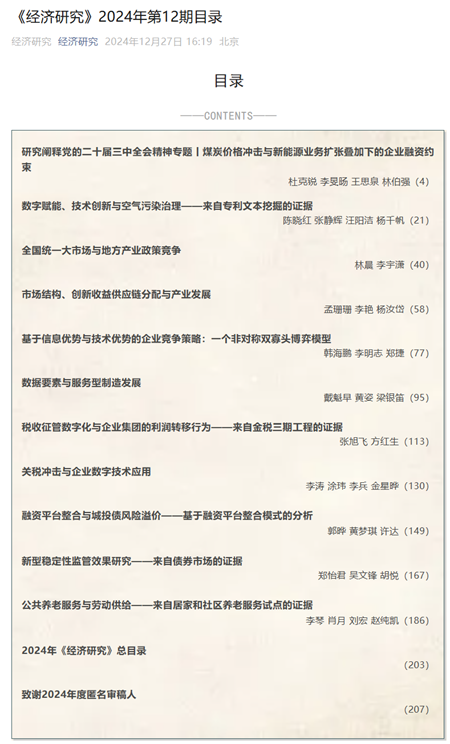 的李明志副教授和博士生韩海鹏同学合作的成果“基于信息优势与技术优势的企业竞争策略:一个非对称双寡头博弈模型”发表于《经济研究》2024年第12期,这是郑捷教授团队在数字经济与行为科学领域的又一重要研究成果,也是郑捷教授2024年发表的第四份A类成果(之前的两份英文工作分别于7月和11月发表于博弈论顶刊Games and Economic Behavior,另一份中文工作于2月发表于《经济研究》)。《经济研究》是中国经济学领域的顶级期刊,代表了中国经济学研究的最高水平,1955年创刊,由中国社会科球探比分网