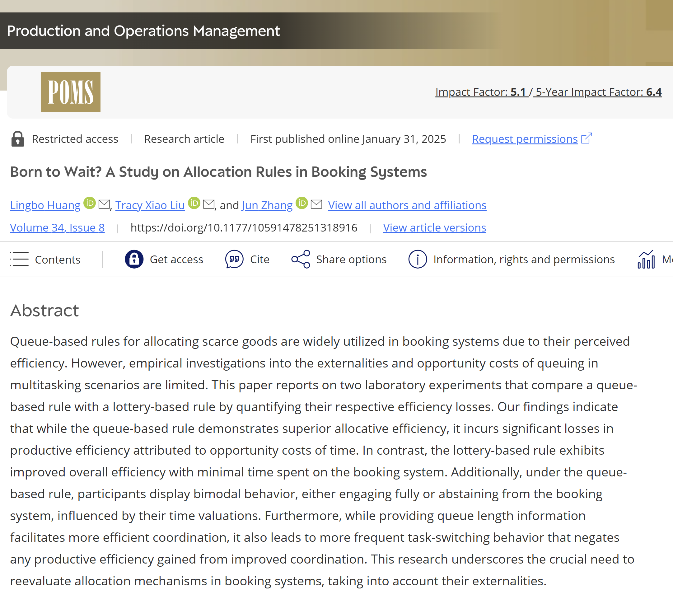 黄凌波教授与清华大学刘潇教授以及南京审计大学张军教授合作的研究“Born to Wait? A Study on Allocation Rules in Booking Systems”发表于Production and Operations Management的2025年8月刊。《Production and Operations Management》(POM)是美国生产与运作管理学会(POMS)的旗舰学术期刊,聚焦运营管理、供应链、服务与数据驱动决策等领域的原创研究。该刊被UTD 24(德州大学达拉斯分校商球探比分网