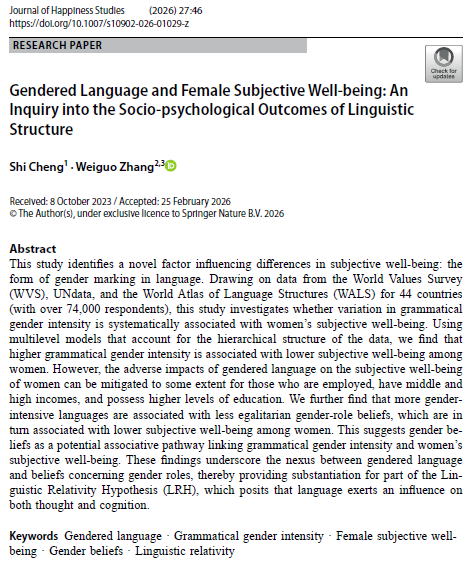 论文信息:Cheng, S., & Zhang, W.(2026). Gendered Language and Female Subjective Well-being: An Inquiry into the Socio-psychological Outcomes of Linguistic Structure.Journal of Happiness Studies,27, 46. //doi.org/10.1007/s10902-026-01029-z