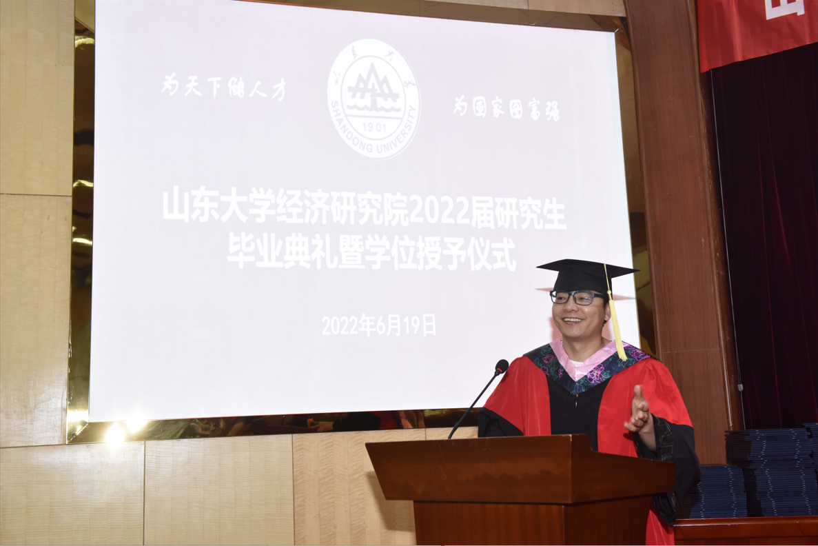 毕业典礼在庄严的国歌中拉开序幕。首先,教师代表,姜树广博士致辞,姜老师用“祝贺”、“不舍”和“嘱托”三个词概括整个发言。“祝贺”:一是祝贺毕业生顺利毕业,二是祝贺毕业生家长儿女成才,三是祝贺所有各位老师桃李成熟;“不舍”是不舍毕业生将离开山大经研院的大家庭,希望毕业后大家仍常回来走动;“嘱托”毕业生在今后的工作生活中能够保持乐观、保持学习和保持信念。