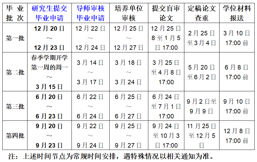 山东大学研究生每年有四次毕业机会,各批次毕业生申请、导师审核时间安排如下: