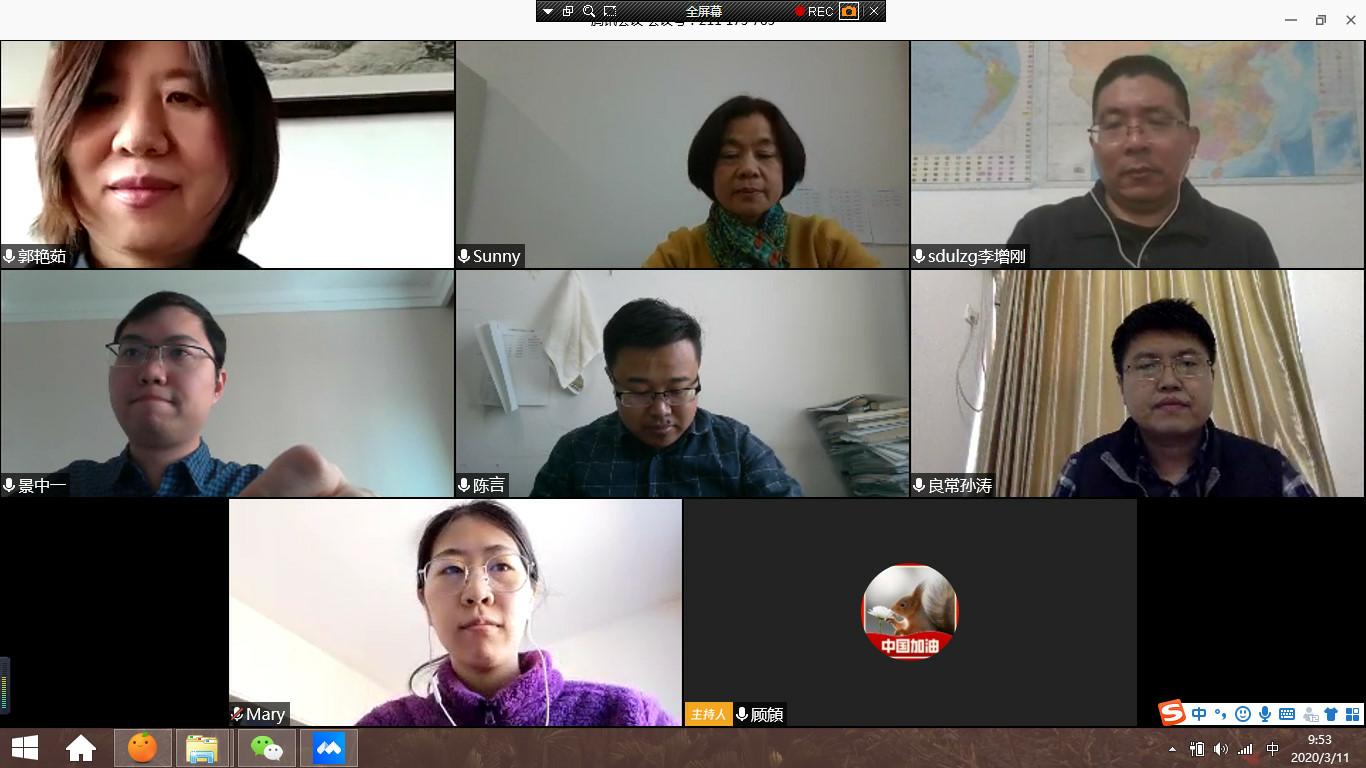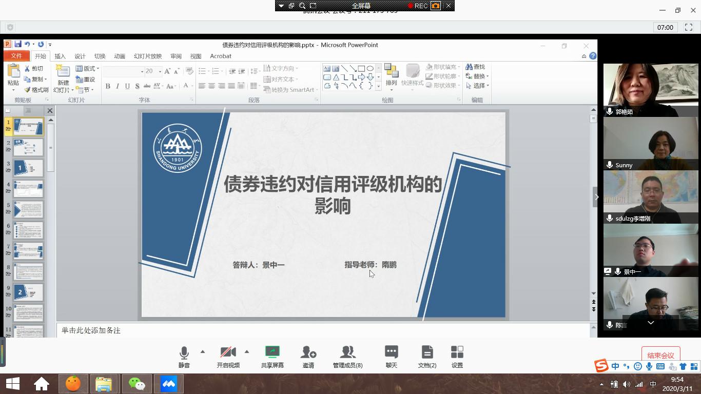 视频答辩利用腾讯会议平台进行。与普通现场答辩不同的是,此次远程视频答辩会的所有成员虽都同处一市但都地处不同。答辩委员会成员共5人:主席由山东财经大学郭艳茹教授担任,委员由球探比分网