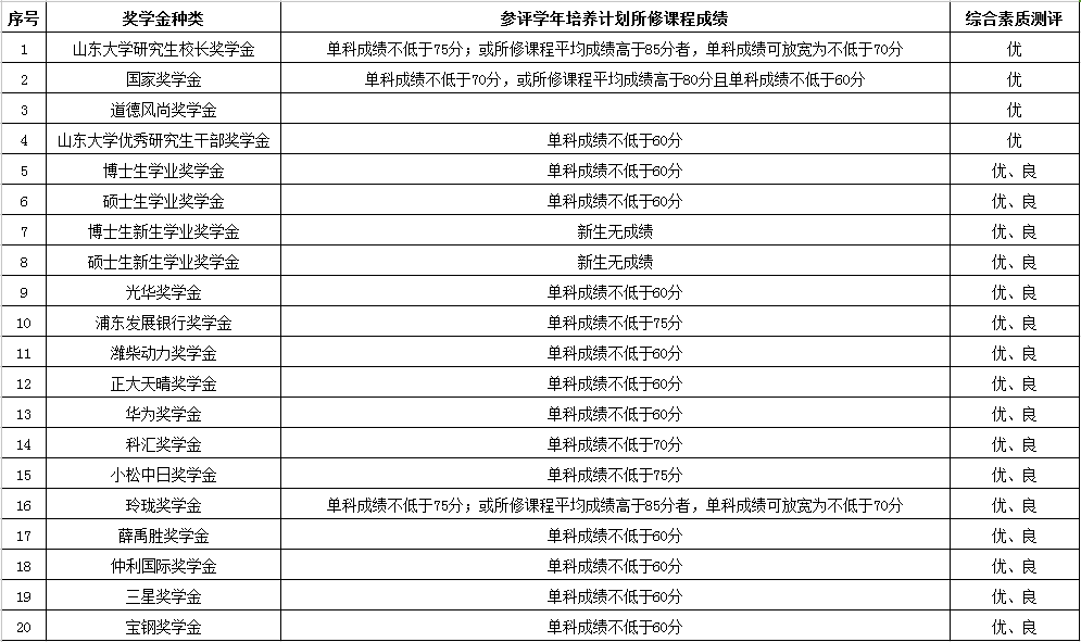 1.研究生奖学金参评范围为具有中华人民共和国国籍,纳入全国研究生招生计划的,录取类别为全日制非定向就业的(档案及工资关系已转入山东大学、无固定工资收入)在学研究生(规定学制年限内)。硕博连读研究生第一二学年按硕士研究生参评,第三至五学年按博士研究生参评;本科直博研究生按博士研究生身份参评。超出规定学制年限的研究生不参与研究生奖学金评审;“高层次人才强军计划”及签订在职协议的“少数民族高层次骨干人才计划”研究生可参与学业奖学金、优秀研究生干部奖学金评比;2012级、2013级七年制选择“原七年制培养模式”学生第六、七年按硕士研究生身份可参与国家奖学金评审。