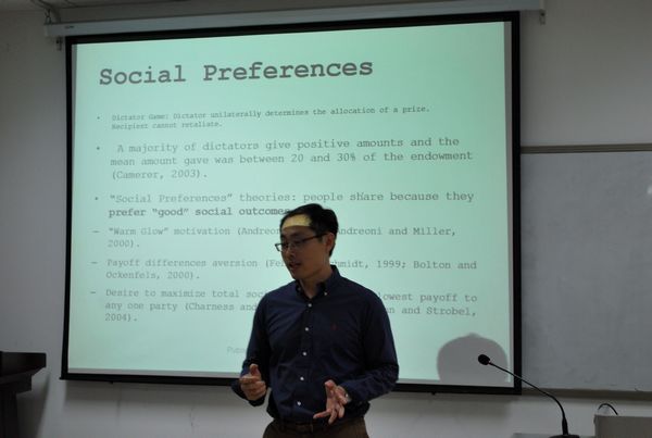的张剑霖博士在邵逸夫科学馆513教室为经研院师生作了题为Putting a Price Tag on Others’Perceptions of Us的报告。丁洁瑶老师主持了报告会。在报告中,张剑霖博士通过dictator game展开话题,通过实验的方法来评估是否人们关心他人对自己的看法。在标准经济理论假设中,人是自私的,幸福感仅仅是来源于收入的增加或减少,而非他人的评价。然而,大量的社会学和社会心理学研究表明,自我认同的发展是通过的理解是怎样被其他人感知得到的。这份报告使用了looking-glass self的概念框架,利用BDM机制中的变量引出依附于参与者认知的货币价值,表明了在环境中,自私的个体表现出强烈的负面认知来避免那些即使不会影响他们货币回报的看法,即愿意花大价钱来避免所谓的负面印象。最后,张剑霖博士与在座的老师同学们交流了在国外学习生活与国内的不同之处,并希望同学们在听课学习之外,合理安排自己的生活节奏,在生活中发现更多new ideals。