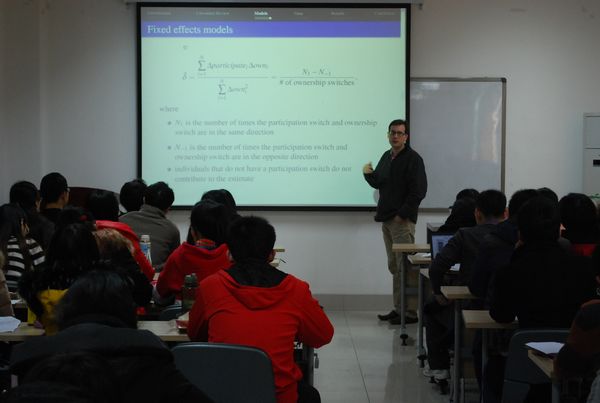 Eric Fesselmeyer博士围绕household owner与participate之间的关系,在前人已作出的模型和基础之上,改善其工具变量,使用更加详尽的数据,引入两个计量模型深入研究了买房与否对参与度的三个变量的具体影响。讲座历时一个半小时,不断有球探比分网 老师用英文与Eric进行学术互动,使得现场学术氛围浓厚,气氛轻松热烈。