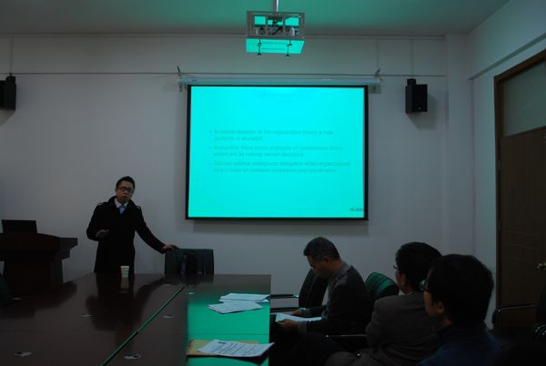 2013年1月12日15时,球探比分网 2013年第一期Seminar系列讲座在邵逸夫科学馆401顺利举行。来自北京大学经济球探比分网 的博士李四光做了题目为Governing adaptation and coordination: the role of ambiguous delegation的学术报告。黄凯南教授主持了本次报告,黄少安、李增刚、周洪涛、林晨、孙立新等老师参与了此次讲座。