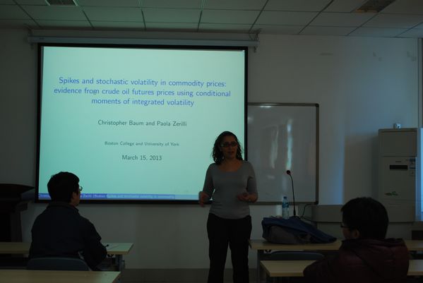 2013年第三期Seminar(总第33期)系列讲座在邵逸夫科学馆513举行。来自约克大学的Paola Zerilli 做了题目为Spikes and stochastic volatility in commodity prices: evidence from crude oil futures prices using conditional moments of integrated volatility的学术报告。本次报告由周洪涛老师主持,黄凯南、林晨、吴吉林和张进峰老师等参与了此次讲座。