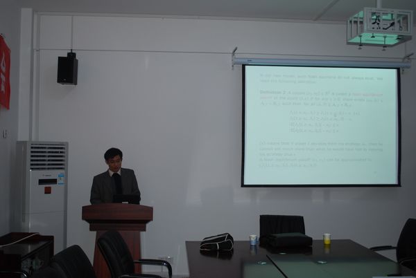 报告期间,林乾博士首先介绍了博弈的历史和发展及随机微分对策。然后重点讲解了非零和的随机微分对策。在这部分讲解中,先是介绍了收益为线性的经典模型,然后引入了倒向随机微分方程,用倒向随机微分方程研究不确定性,应用于金融市场。最后,林乾博士详细介绍了他所建立的模型,用零和博弈来考虑非零和的微分对策,找到了一个纳什均衡收益。