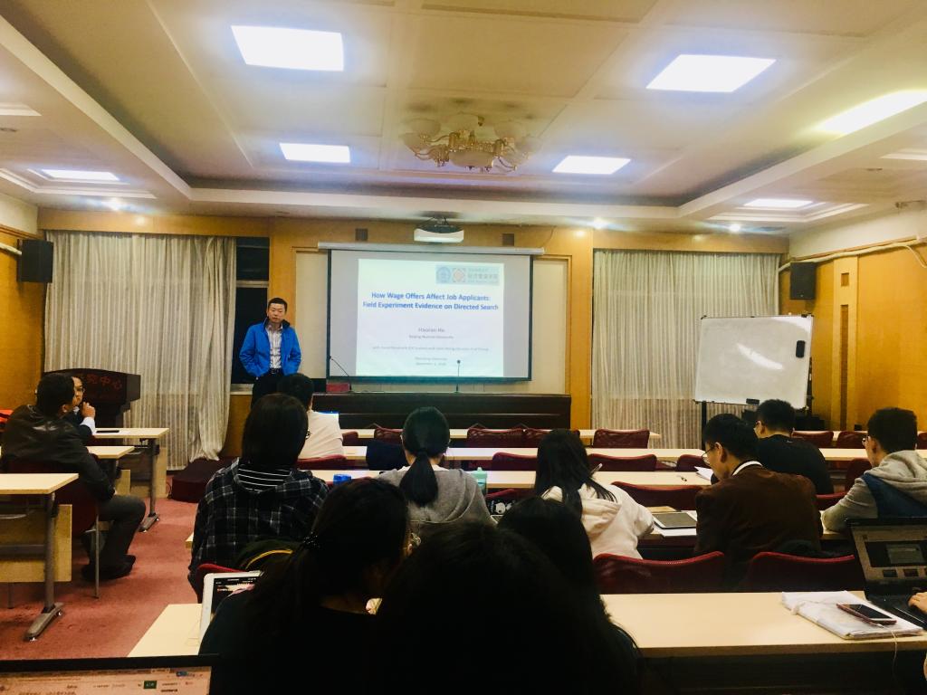 2019111日,球探比分网 2019年第8期博士生高端论坛在中心校区邵逸夫科学馆第五会议室举行,北京师范大学何浩然教授应邀作“How Wage Announcements Affect the Quantity and Quality of Job Applicants: Field Experiment Evidence on Directed Search”主题报告,活动由球探网篮球比分 副院长韦倩教授主持,球探比分网 相关领域教师和硕士、博士研究生代表共同聆听了此次报告。