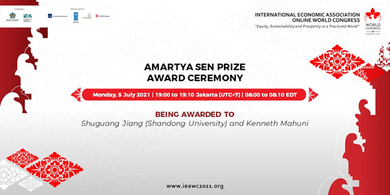 “Amartya Sen Prize” Award Ceremony was held online on 5 June 2021during the 19th World Congress of the International Economic Association (IEA). The Award Ceremony was hosted by Professor Kaushik Basu, the current president of the IEA. Professor Eric Maskin attended the ceremony and gave a keynote speech after the ceremony. Professor Shuguang Jiang from our Center was awarded one of the two Amartya Sen Prizes.
