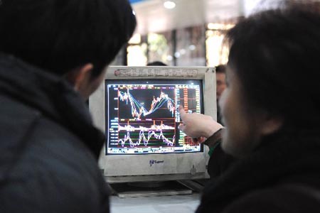 Investors read stocks information at a stock exchange in southwest China's Chongqing Municipality Feb. 13, 2008. (Xinhua File Photo)